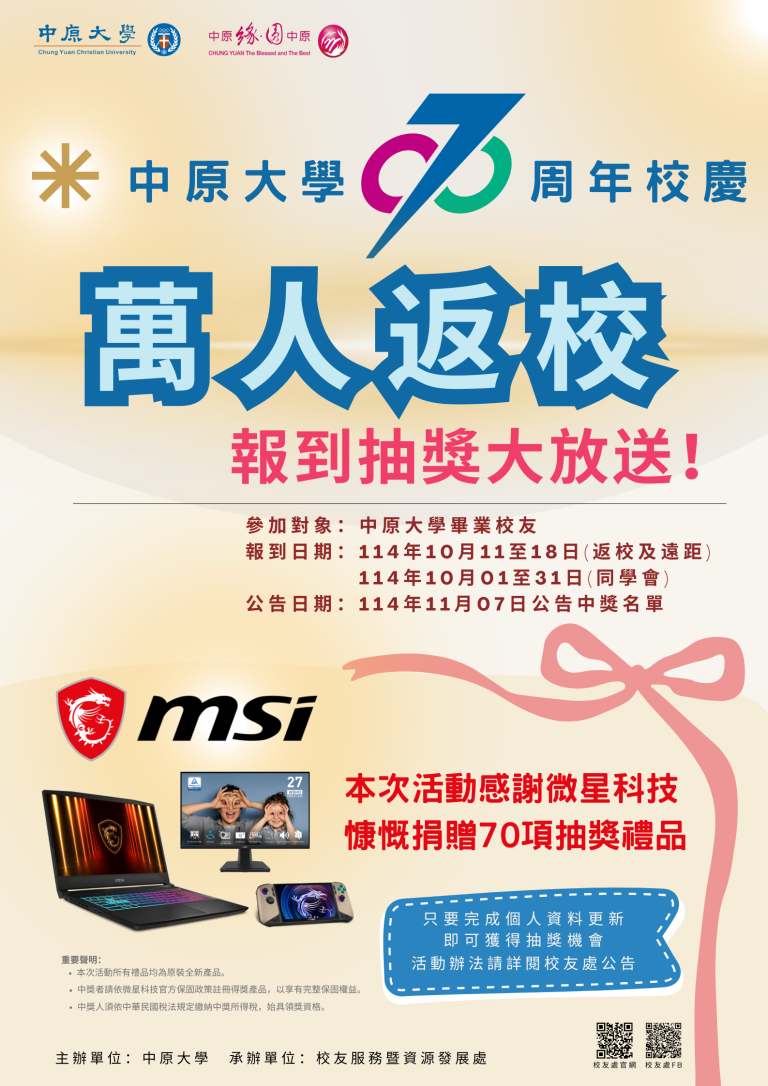 歡慶中原大學70周年校慶!凡依下列方式完成報到者,即具「萬人返校報到抽獎」資格,共有70項好禮,等你來拿!